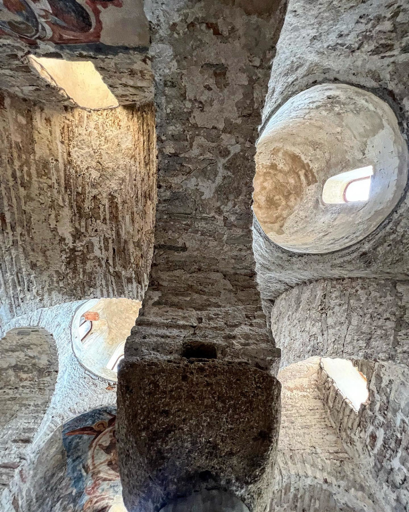 Als je binnen staat, merk je hoe slim dit plan is: vier zuilen dragen de bogen en maken van een piepkleine ruimte toch een verticale, bijna monumentale beleving. Je ogen worden vanzelf naar boven getrokken, richting de koepels.